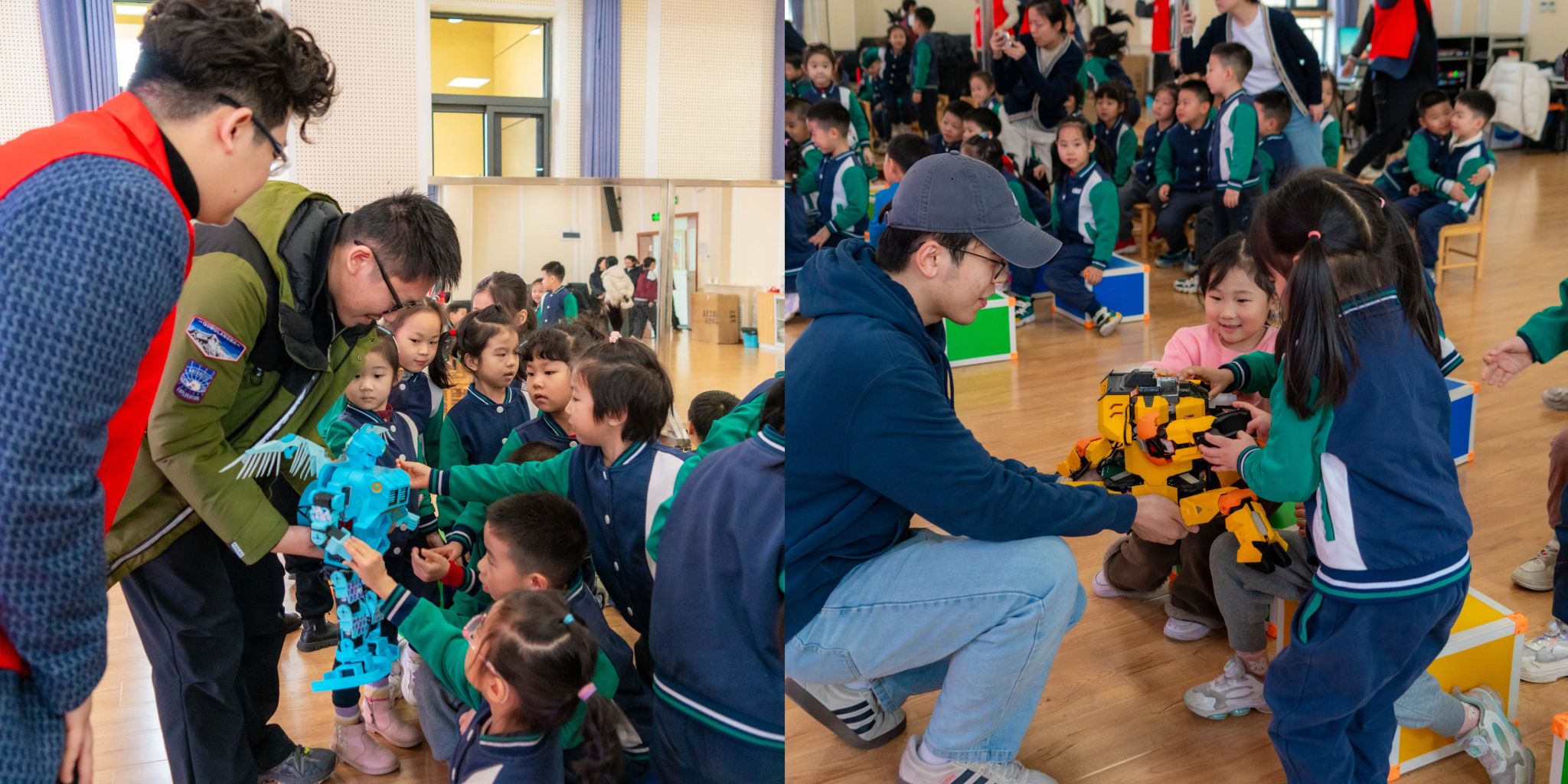创意小机器人模型参观环节,孩子们观看、触摸机器人,与机器人亲密互动,在亲身体验机器人的魅力和风采的同时深刻感受来自科学技术的神奇力量。展示过程中,志愿者们耐心地解答孩子们提出的问题,鼓励他们勇于探索未知的世界。