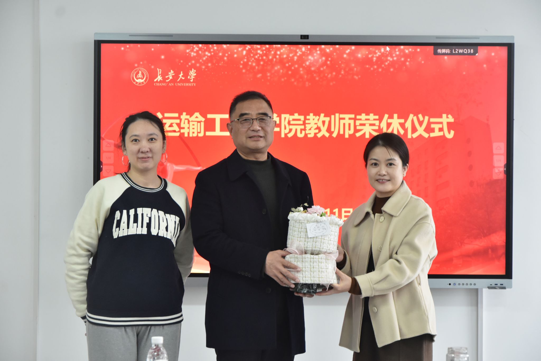 院工会主席徐婷,教师代表、交通工程系党支部书记张敏为田新民赠送鲜花和纪念品。