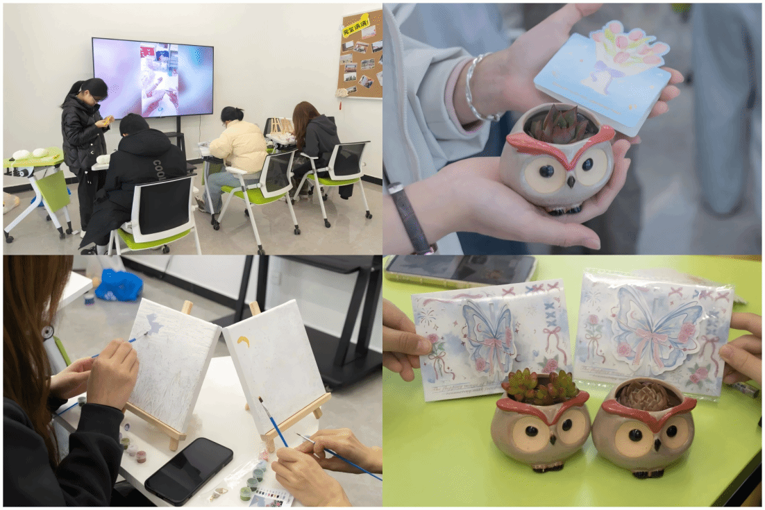 本次活动旨在通过丰富多彩的手工DIY活动,帮助女性师生释放压力,提升幸福感。活动伊始,心理中心教师程铃琳给大家带来了一场题为“关爱自我,从心开始”的微讲座。程铃琳从女性常见的心理困扰入手,结合生动案例,深入浅出地讲解了压力管理、情绪调节等方面的心理知识,并分享了实用的减压技巧,引导大家关注自身心理健康,学会爱自己、呵护自己。随后,程铃琳带领大家体验沉浸式动手实践带来的心灵减压效果,大家通过手绘、手作的方式,用画笔勾勒出一件件精美的作品,用色彩表达着内心的情感与对生活的热爱,并在卡片上写下内心深处对自己、对亲友的祝福,共同将绿植种进春天的泥土里,传递着对美好未来的期许。