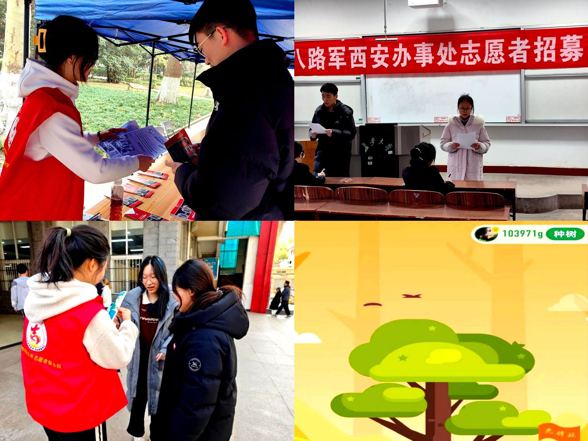弘扬红色基因,共播绿色希望。3月2日,学院联合八路军西安办事处开展志愿者招募活动,经过系统培训的“红色讲解员”用专业与热情让革命历史鲜活呈现;3月19日,在“植此青绿”线上植树活动中,学院师生汇聚55.36万滴能量,让五棵生命之树扎根生长。从红色记忆守护到绿色家园建设,学院正以实际行动铺就双色之路,让青春在传承与创新中绽放绚丽光彩。