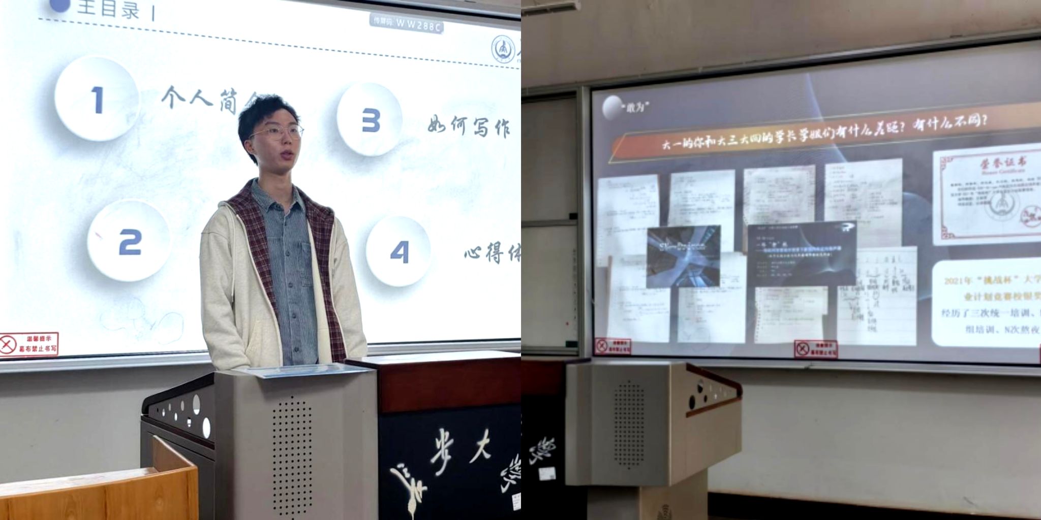 以“学术研究与创新创业”为焦点,深耕学术创新,勇攀科创高峰。“双创之星”牛丙成以“道术论”和“生命线”为框架,详解学术论文写作的七大要点;“双创之星”霍嘉怡结合自身从校赛银奖到国家级奖项的科创经历,在线上鼓励同学们“勇于试错、在摸索中成长”。第三场宣讲会锚定“创新突围”,通过科研实战经验解锁学术进阶密码。