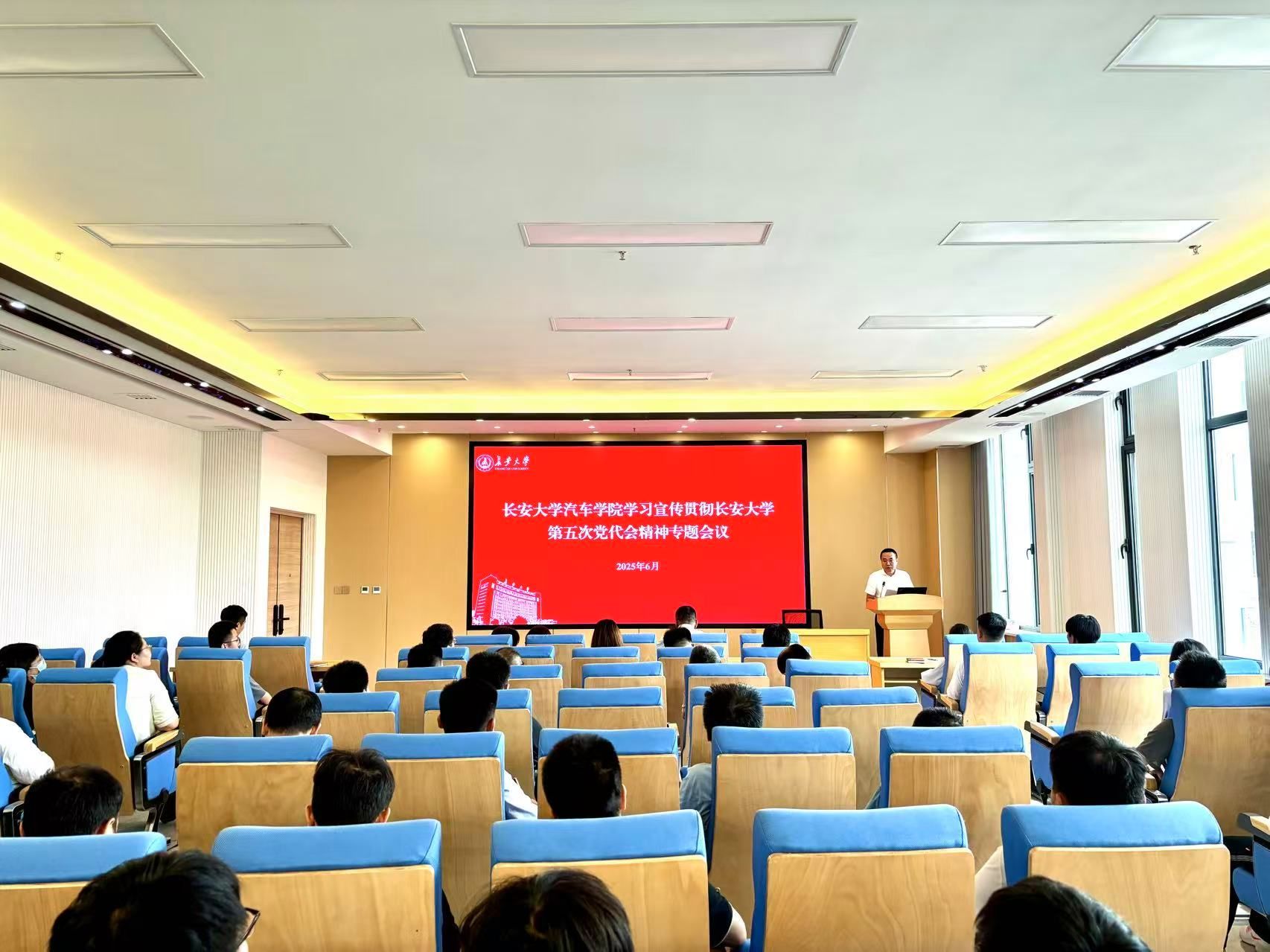 6月4日,汽车学院召开全体教职工大会,传达学习学校第五次党代会精神,安排部署深入学习宣传贯彻学校第五次党代会精神工作。学院领导班子全体成员、全体教职工及学生党员代表参加会议。党委副书记、副院长、分纪委书记周姗姗主持会议。