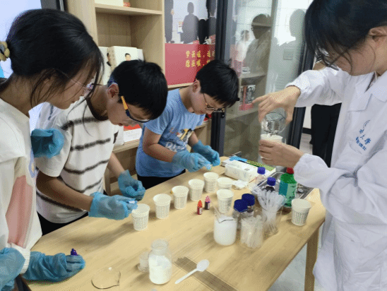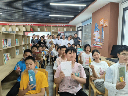 在“学习书屋”,理学院化学与材料科学系为青山镇中心学校的学生代表带来了“化学神奇世界:探索科学奥秘”主题科普实验演示,教师们通过“大象牙膏”、“下雪啦”、高锰酸钾褪色实验、烧杯里的“时光机”等趣味互动环节,带领孩子们观察“高锰酸钾褪色”“聚丙烯酸钠吸水膨胀”“碘钟与BZ振荡反应周期变化”等奇妙化学现象。实验间隙,机关党委组织了爱国主义教育知识竞答,通过单选、简答等形式激发学生参与热情,并向优胜者发放活动奖品。这种“科学实验+红色教育”的双轨模式,既通过沉浸式实操体验激发学生对科学的探索欲,又以知识竞答厚植家国情怀,实现“科创启智”与“立德树人”的深度融合。