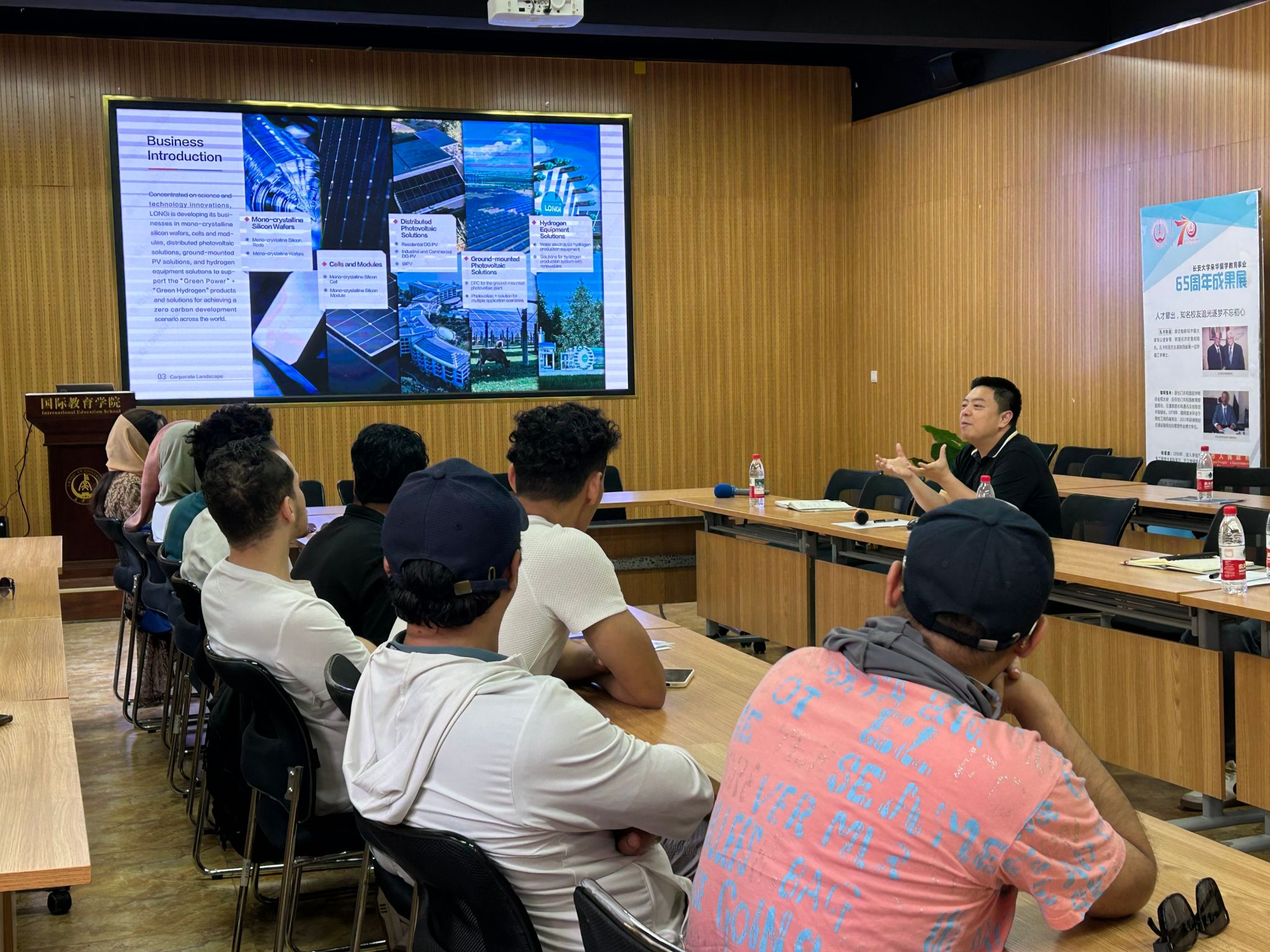 张研表示,在全球碳中和进程加速推进的时代背景下,绿色产业的创新发展已成为推动世界经济绿色转型的核心引擎,材料学院长期致力于培养兼具专业素养与跨文化胜任力的国际化人才,希望通过与隆基绿能的深入交流,加强学生对未来职业规划的清晰认识。戴坚向与会留学生系统介绍了隆基绿能以科技创新驱动全球能源转型的战略背景,强调了国际化战略是公司发展的核心定位,并期待整合全球智慧资源,共同推进“Solar for Solar”零碳发展目标。