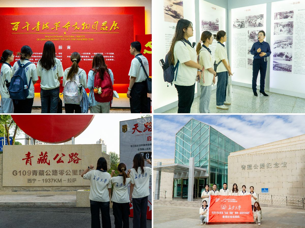 在青海省为期7天的调研时间里,实践队先后参观了青藏公路文化体验馆、青海省博物馆、青海藏文化博物院、格尔木将军楼公园等与“两路”精神息息相关的坐标。在这里,一把把发红生锈的简陋工具、一个个在雪域高原奋战的身姿、一件件绚丽多彩的民族文化作品……一一在实践队员们眼前呈现,让他们走进青藏高原、走近青藏公路,触摸着一段段在雪域高原书写的波澜壮阔的筑路史。