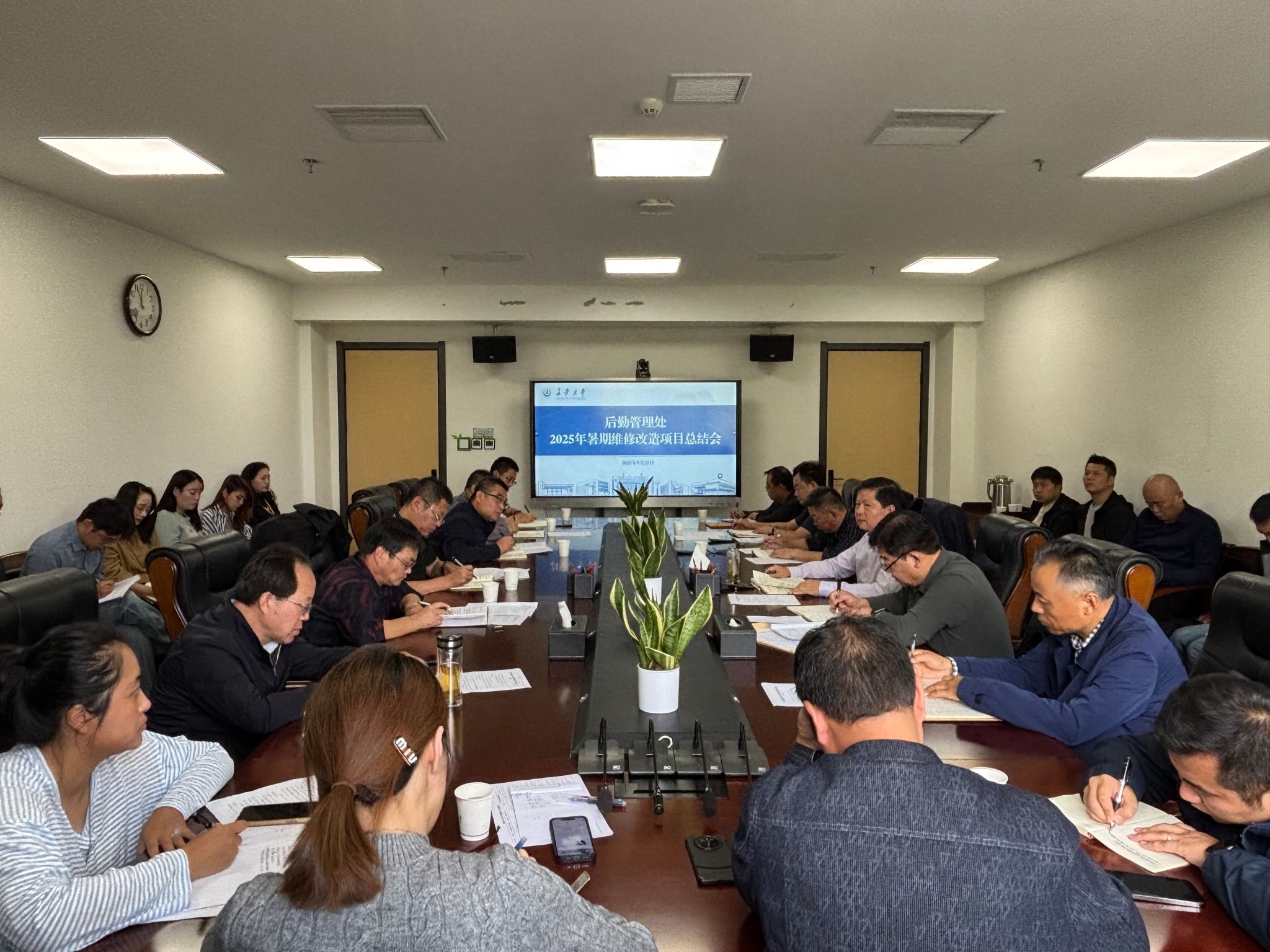 9月25日上午,后勤管理处2025年暑期维修改造项目总结会议在北校区师生服务大厅二楼第二会议室召开。副校长黎开谊出席会议并讲话,后勤管理处全体领导班子成员、负责项目实施的中心(科室)副科级及以上干部参加会议,会议由后勤管理处处长侯贻栋主持。会议主题是总结经验,查摆问题,分析原因,整改落实,鼓舞士气,为今后后勤服务保障水平提升提供支撑。