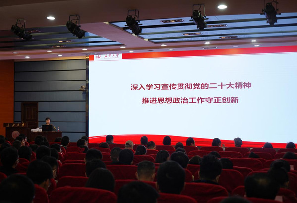 郗波重点围绕深入理解党的二十大精神丰富内涵,准确把握党的二十大精神对高等教育的定位和要求,以党的二十大精神为指引推动思想政治工作守正创新三个方面展开宣讲。郗波指出,党的二十大报告深刻阐述了新时代坚持和发展中国特色社会主义的一系列重大理论和实践问题,勾勒了全面建设社会主义现代化国家、推动中华民族伟大复兴的宏伟蓝图,为新时代党和国家的发展指明了方向,提出了行动指南。大学肩负着建设教育强国、科技强国、人才强国的崇高使命,为中国式现代化建设提供有力的基础性、战略性支撑。郗波强调,高校思想政治工作事关党对高校的领导,事关社会主义办学方向,事关意识形态安全。推动新时代思想政治工作守正创新,需要科学把握新时代高校思想政治工作虚与实、表与里、远与近、高与低、点与面、内与外重要关系,实现虚功实做、表里如一、远近兼顾、高低相成、连点成面、内外联动。她指出,新时代辅导员要做到增强思想政治工作网络化意识,构建思想政治文化阵地,丰富思想政治工作的内容,创新思想政治工作方法,建造一支专门化、技术化、素质高的网络思想政治教育队伍。