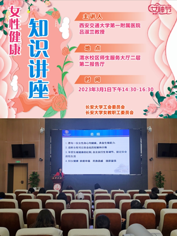 在第113个“三八”国际劳动妇女节来临之际,为更好的凝聚力量,切实加强对女教职工的人文关怀,提升女教职工疾病防范意识,3月1日下午,工会在北校区渭水师生服务大厅第二报告厅,举办女性健康知识讲座,讲座采取线上、线下相结合的方式进行,全校100余名女教职工现场聆听了报告。讲座由工会副主席范婷主持。