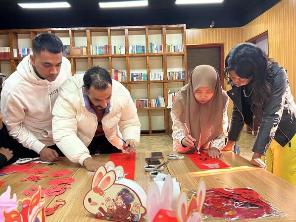 1月16日,正值癸卯兔年来临之际,国际教育学院院长张伟、副院长吕卫东看望慰问在校国际学生及留学生公寓物业值班人员,为他们送去节日的祝福与温暖。并邀请来自西安市公安局出入境管理局外管一科的曹宇警官和刘羽警官从签证、住宿、非法行为等方面为22级新生以及入境返校国际学生作详细介绍。活动合影1月14日,小年当天,学院举办了文化体验活动,邀请国际学生剪窗花、写对联、做灯笼,感受浓厚春节氛围,体验特色中国文化,在KY开元过温暖、有趣的中国年。(审稿:吕卫东 网络编辑:韩月)
