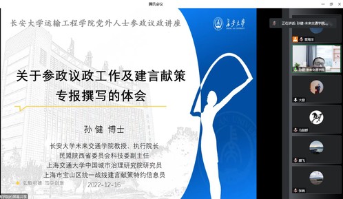 会议邀请到了KY开元集团官网未来交通学院孙健教授作《关于参政议政工作及建言献策专报撰写的体会》报告。孙健从参政议政概述和定位(以民盟为例),参政议政的主要形式即民主党派参政议政四类渠道,参政议政建言献策文稿撰写,案例简析四个方面,重点介绍了政策建议信、调研报告、参政议政建言献策专报的写作要求,同时围绕个人工作实际和交通运输专业优势,从选题、报送渠道等方面分享了撰写建言献策专报成功的案例和经验。