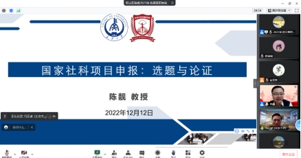 12月12日,外国语学院举办第十五期学术沙龙,复旦大学外文学院陈靓教授受邀作“国家社科项目申报:选题与论证”的主题分享。本次学术沙龙采取线上方式进行,由院长冯正斌教授主持,我院部分教师和全体研究生参加。