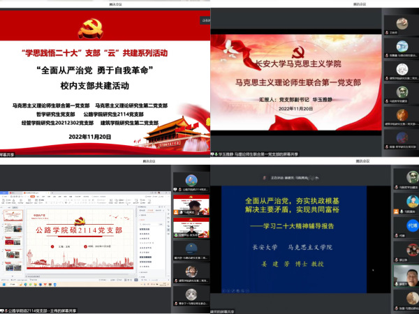 为深入学习宣传贯彻党的二十大精神,11月20日晚,马克思主义学院研究生各党支部联合公路学院研究生2114党支部、经管学院研究生20212302党支部、建筑学院研究生第二党支部线上开展“学思践悟党的二十大”支部“云”共建系列活动之“全面从严治党,勇于自我革命”校内支部共建活动,活动邀请马克思主义学院党委副书记郭云珠、马克思主义学院姜建芳教授参会指导,共建支部近200人参加活动。