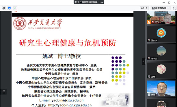 姚斌教授从研究生的一般特点、研究生常见心理问题及帮助对策、心理危机的预防与干预、心理健康教育工作体系建设四方面开展专题讲座。会上,姚斌教授分析了造成研究生心理问题的原因,强调了解研究生心理健康状态的重要性。他指出,作为高校教育工作者,要能识别学生的心理问题,及时发现心理危机并做好干预,同时对如何处理学生心理问题和危机给出对策,例如导师与学生充分交流、掌握沟通技巧等。