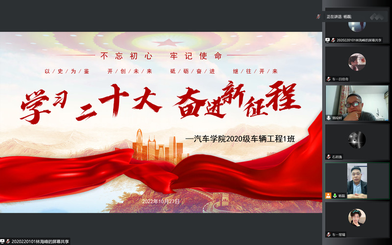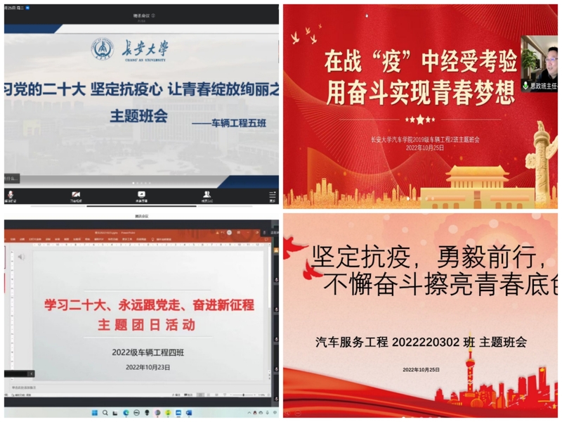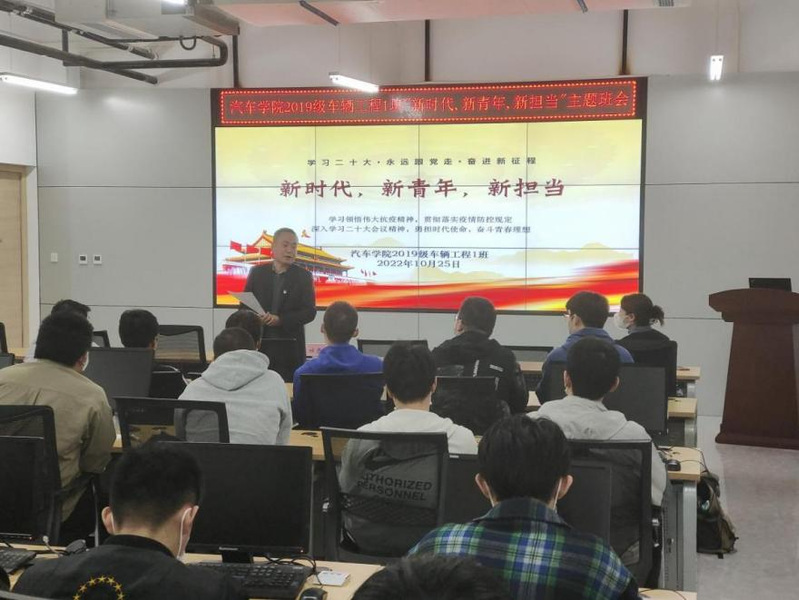 为进一步做好学院学生的思想政治教育工作,贯彻落实疫情防控规定,同时深入学习党的二十大精神,10月24日至27日,汽车学院在全院范围内召开疫情防控主题班会,院党委书记林贵宝、院长郭应时、党委副书记、副院长杨密侠、党委副书记倪凤英、副院长邱兆文、赵轩及各年级班主任、思政班主任、辅导员深入一线主持开展,全院全体学生积极参与,实现本科生班级全覆盖,研究生导师负责集中教育。