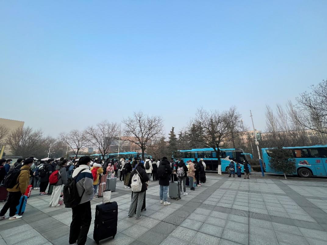 天虽尚寒,心已向暖。1月17日凌晨4点,外省学生两站一场(火车站、高铁站、飞机场)转运工作如期开启。寒风刺骨,辅导员的叮嘱、志愿者的坚守,却让同学们内心深处感到格外温暖。校园里行李箱拖曳的声音此起彼伏,一辆辆大巴车在车站和校园间穿梭,将寒意全然冲散。