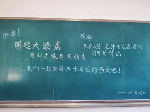 1月11日,隔离点临时党支部组织开展“健康监测期满留言板书征集”活动,同学们纷纷用文字、绘画等形式把自己想给家人、给朋友、给志愿者说的话通过板书的形式展现出来。“明远大酒店奇幻之旅即将结束,让我们一起期待车水马龙的西安吧”“西安加油,长安常安”……《大爱无疆》的作者,公路学院城市地下空间工程专业2021级本科生白雨藤这样说道:“每次看到放在门口的尚有余温的饭菜,每次看到医护人员跑上跑下的上门核酸,内心总是充满温暖和力量。感谢为疫情防控付出的每一个人,祝愿山川无恙,花满长安。”