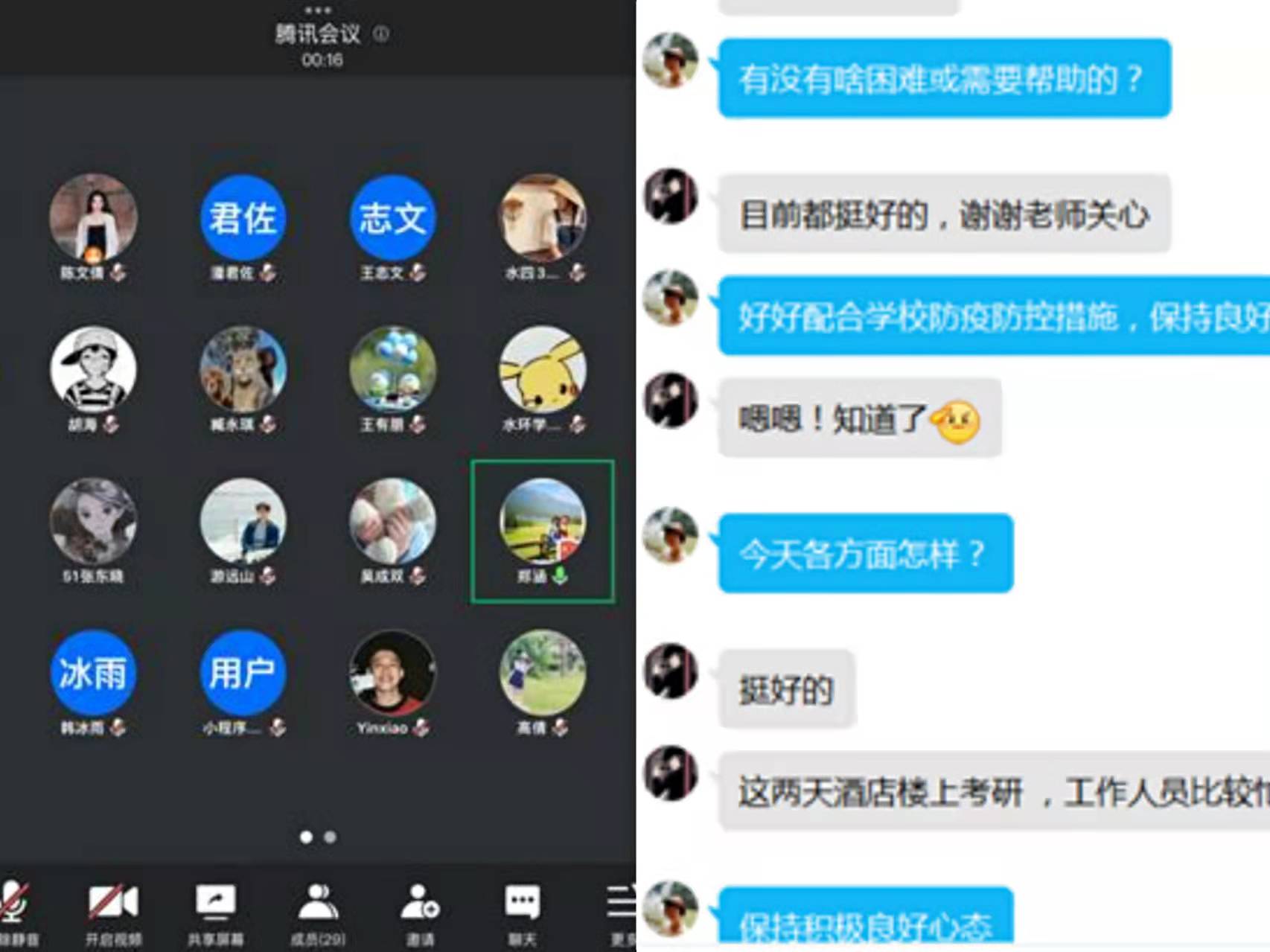 业精于勤荒于嬉,行成于思毁于随。在这场疫情大考中,水环学院充分发挥辅导员、班主任、思政班主任老师的引领作用,带头切实履职尽责,弘扬伟大抗疫精神,各位老师纷纷积极行动起来,通过多种线上形式关心关爱学生,帮助学生缓解焦虑情绪、调整学习状态。