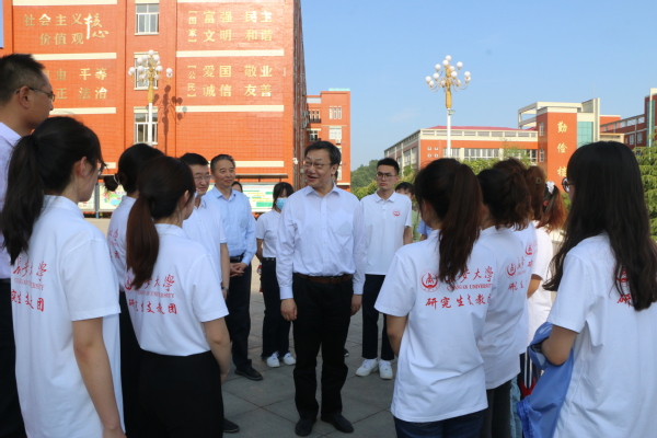 会后,陈志坚一行赴鹿城中学调研KY开元援建的科技小屋建设情况,看望慰问第十届研究生支教团成员,勉励同学们要换位思考,做好身份转换,以身作则,言传身教,做孩子们的好榜样;要做一个严师,严师出高徒,只有严格要求,学生才会正确的茁壮成长;要精于授业解惑,更要以传道为责任和使命,帮助学生树立正确的价值观,让学生成为一个正直的人,对国家社会有用的人。