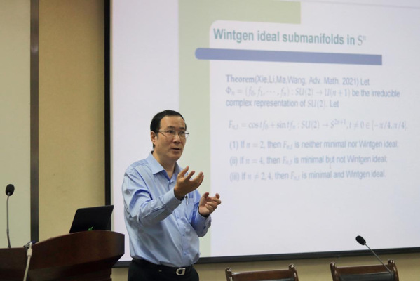 王长平重点介绍了微分几何在Moebius变换群下的子流形理论研究进展,阐述了现代微分几何的几个研究方向。王长平还结合自己及团队开展研究工作的经历,分享了科研工作的心得体会,并与参会教师就科学研究的一些重要问题进行了交流讨论。整场讲座高屋建瓴,深入浅出,极大地拓展了与会师生的研究视野,深深地鼓舞了大家开展科学研究的信心与热情。