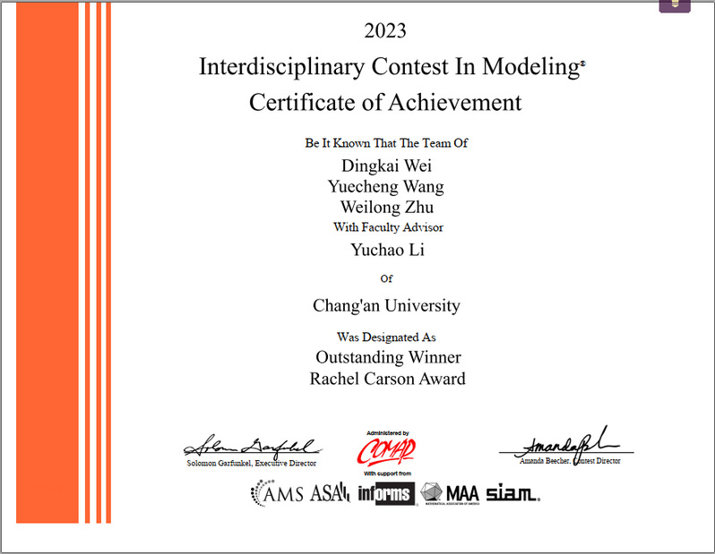 近日,2023年美国大学生数学建模竞赛(MCM/ICM)成绩正式揭晓。KY开元学子获特等奖(Outstanding)1项、单项奖“Rachel Carson Award”1项、特等提名奖(Finalist)4项,一等奖(Meritorious Winners)12项,二等奖(Honorable Mention)31项。其中,理学院李玉超老师指导的由卫丁恺、王玥程、朱威龙三位同学组成的团队,成为全球唯一同时获得最高奖项特等奖(Outstanding)与单项奖“Rachel Carson Award”的团队。