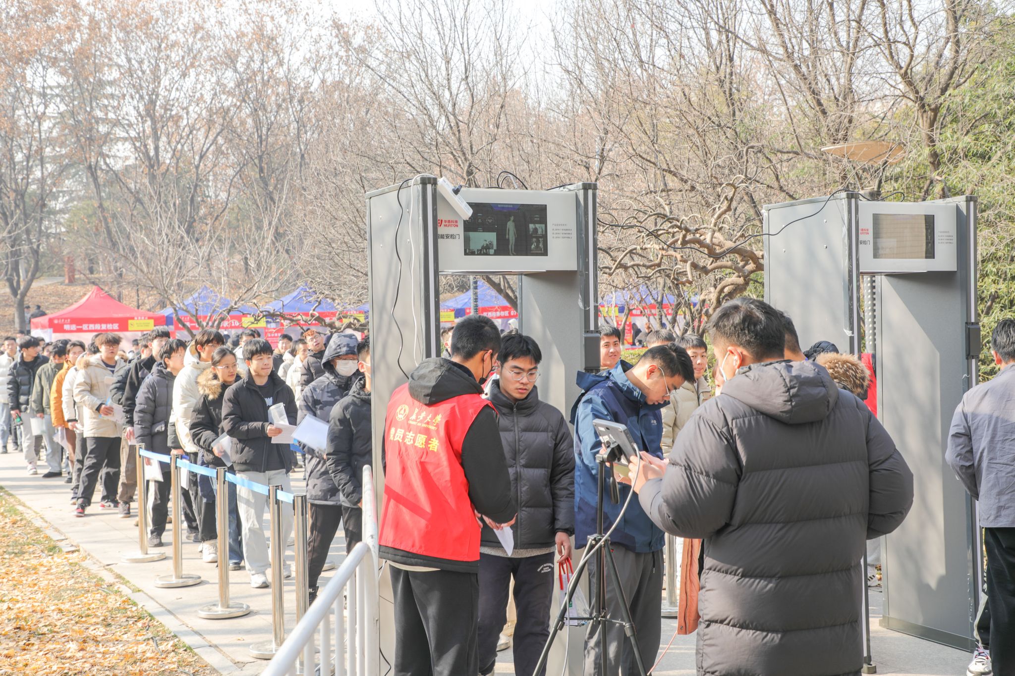 本次研究生招生考试新增了智能安检环节,学校配备了智能安检门、人脸识别仪等检测设备,设置复检通道、复检帐篷,考生们经过严格检查,有序排队进入考场。在现场,学校还搭建了考生包裹存放点,400余名志愿者在现场为考生提供服务,确保考试组织合规严谨、考生进场顺利有序。