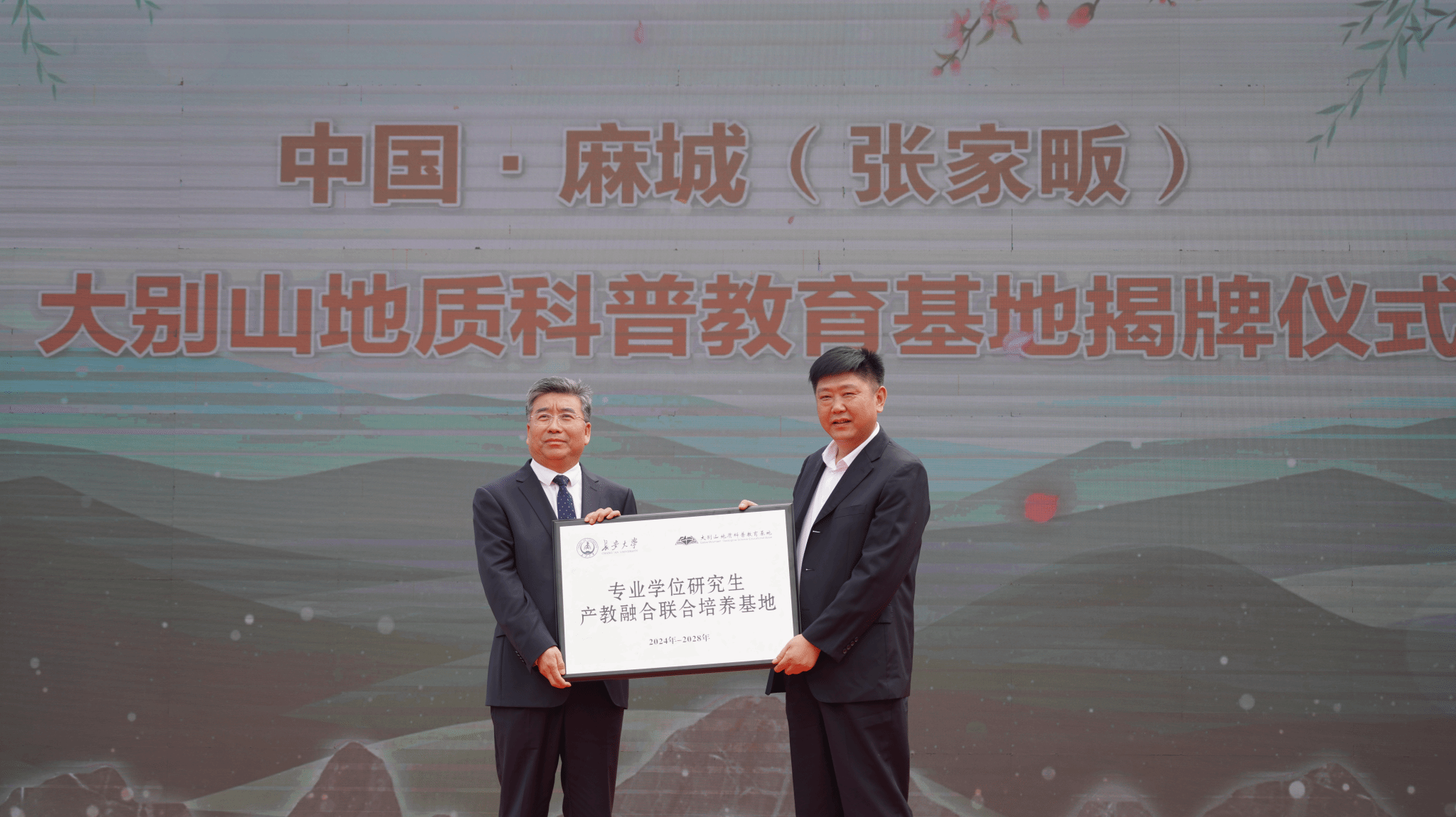 范文代表学校为专业学位研究生产教融合联合培养基地授牌。他指出,彭建兵院士充分发挥学校学科特色和科研力量,带领团队投入教育基地和文化村建设,为基地的建成倾注了大量心血,希望通过建立研学基地,推动校地双方在人才培养、科学研究、科普教育等方面开展深入合作,把地质科普馆建成重要的育人平台、文化建设的“主阵地”、对外交流与形象展示的“新窗口”、社会科普教育的“打卡地”和深受群众喜爱的“新地标”。