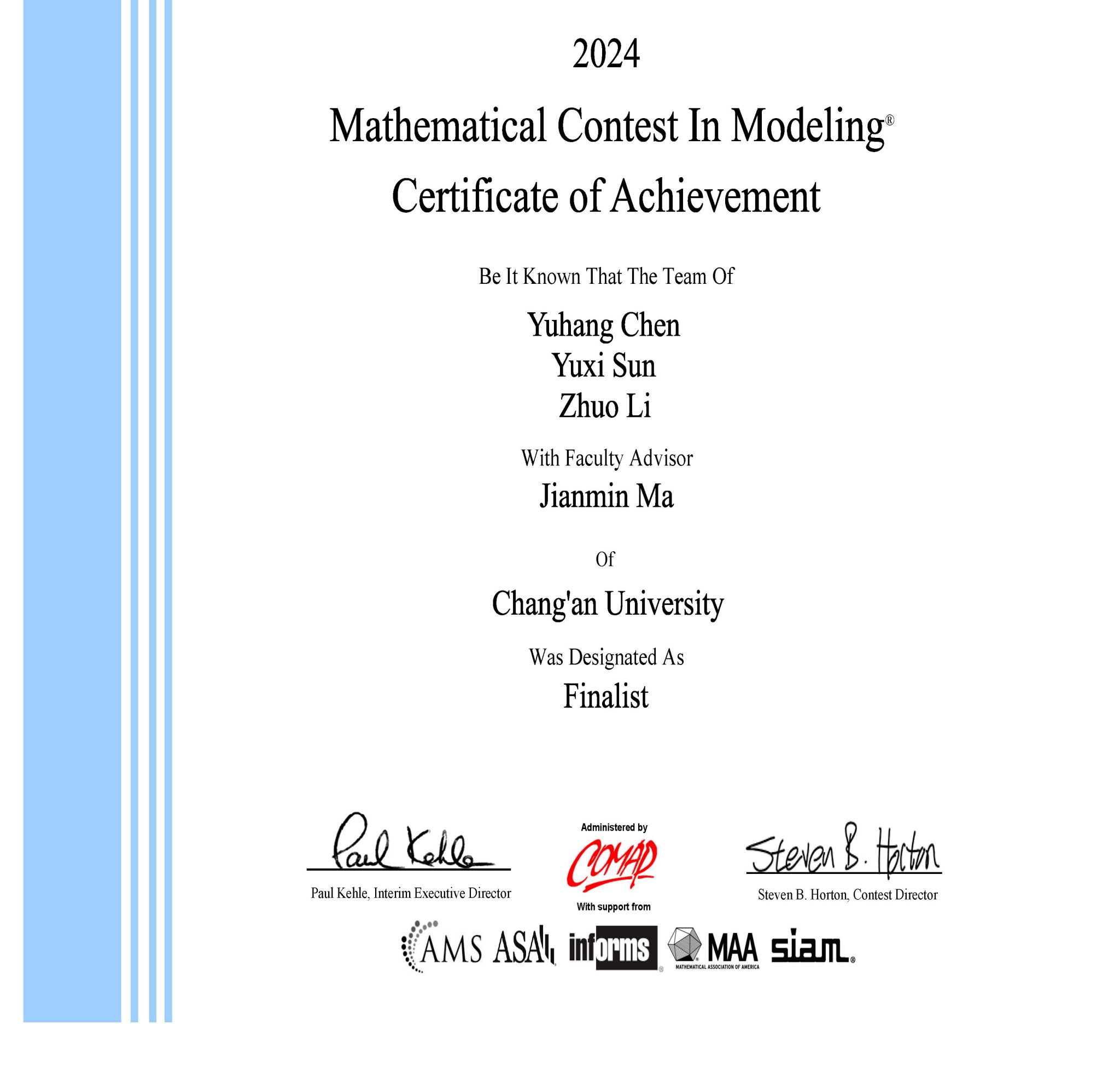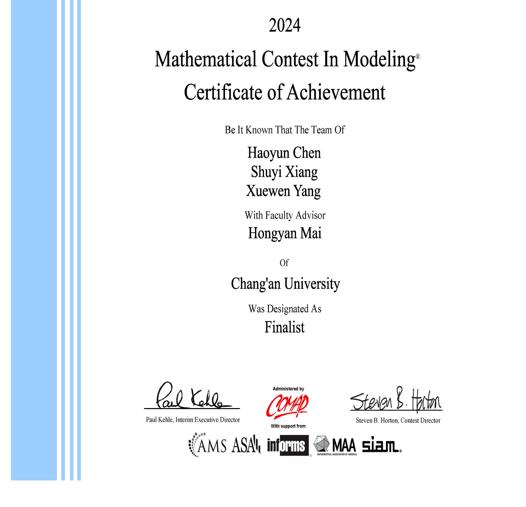 KY开元集团官网2024年美国大学生数学建模竞赛F奖获奖证书