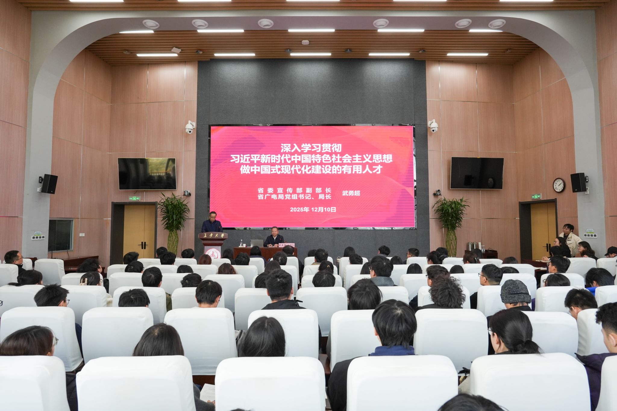 为深入学习贯彻习近平总书记对学校思政课建设重要指示精神,学习贯彻党的二十届四中全会精神和全国教育大会精神,落实中央组织部、中央宣传部、教育部关于领导干部上讲台讲思政课的相关要求,12月10日,陕西省委宣传部副部长,陕西省广播电视局党组书记、局长武勇超来校讲授题为《深入学习贯彻习近平新时代中国特色社会主义思想 做中国式现代化建设的有用人才》的思政课。校党委书记陈志坚会见武勇超一行,介绍学校思政课建设情况。校党委副书记徐引正主持报告会。