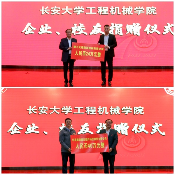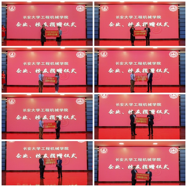 徐引正和学院党政领导代表学校分别接受了许昌德通振动搅拌科技股份有限公司、柳工无锡路面机械有限公司、河南卫华重型机械股份有限公司、北京加隆工程机械有限公司、河南校友会、北京首旺科技有限公司、罗选民、济南力拓工程机械有限公司/戴纳派克(中国)压实摊铺设备有限公司、无锡中凯机械有限公司/陕西华亿交通科技有限公司、西安卓士博液压工程有限责任公司等10家企业和个人的捐赠。