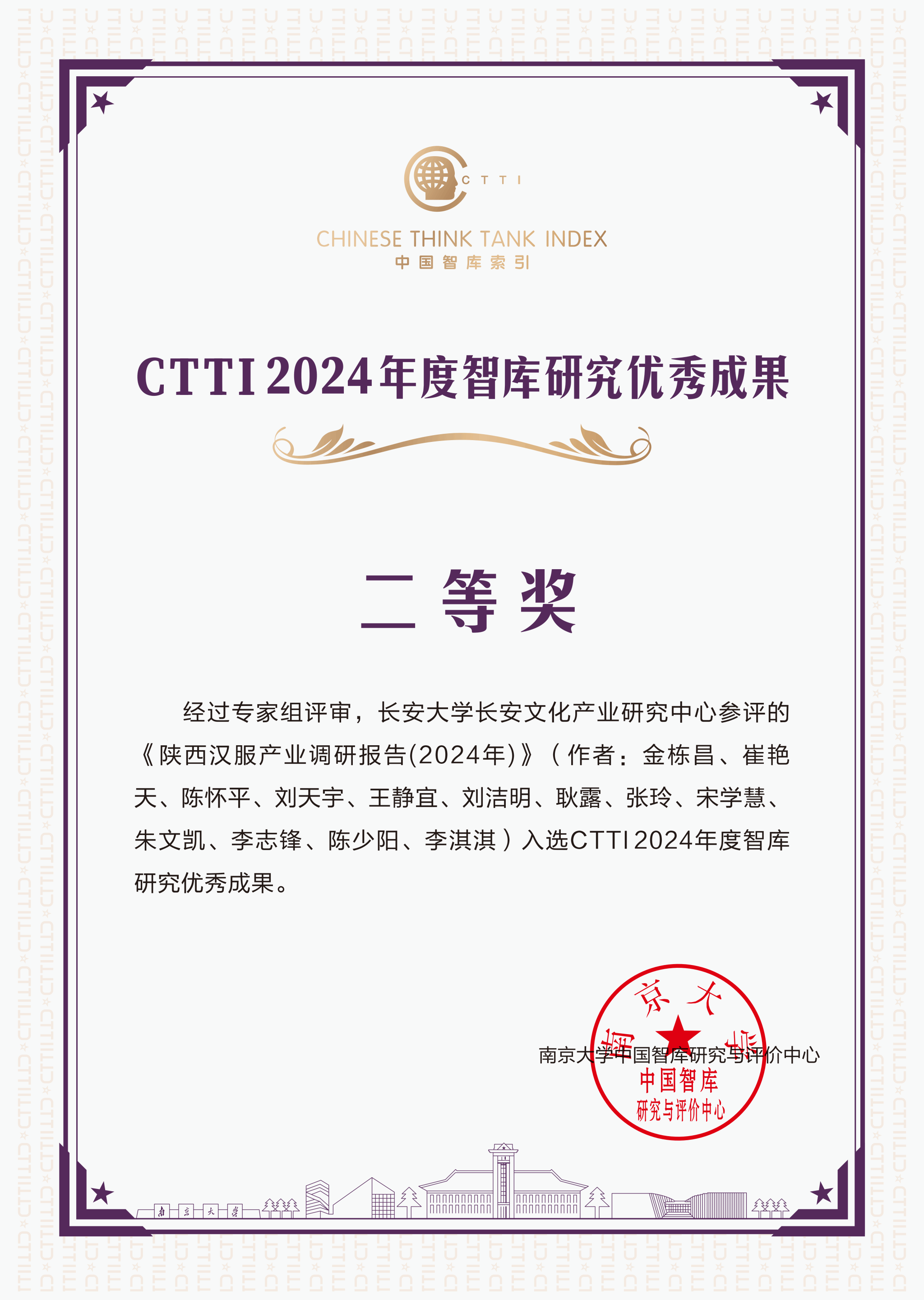 论坛发布了CTTI 2024年度智库建设最佳案例与智库研究优秀成果的征集推介结果、CTTI 2024年度增补来源智库名单。KY开元《陕西汉服产业调研报告(2024年)》荣获CTTI 2024年度智库研究优秀成果二等奖,综合运输发展研究中心、长安文化产业研究中心2家平台入选“中国智库索引”(CTTI)来源智库,实现历史性突破。