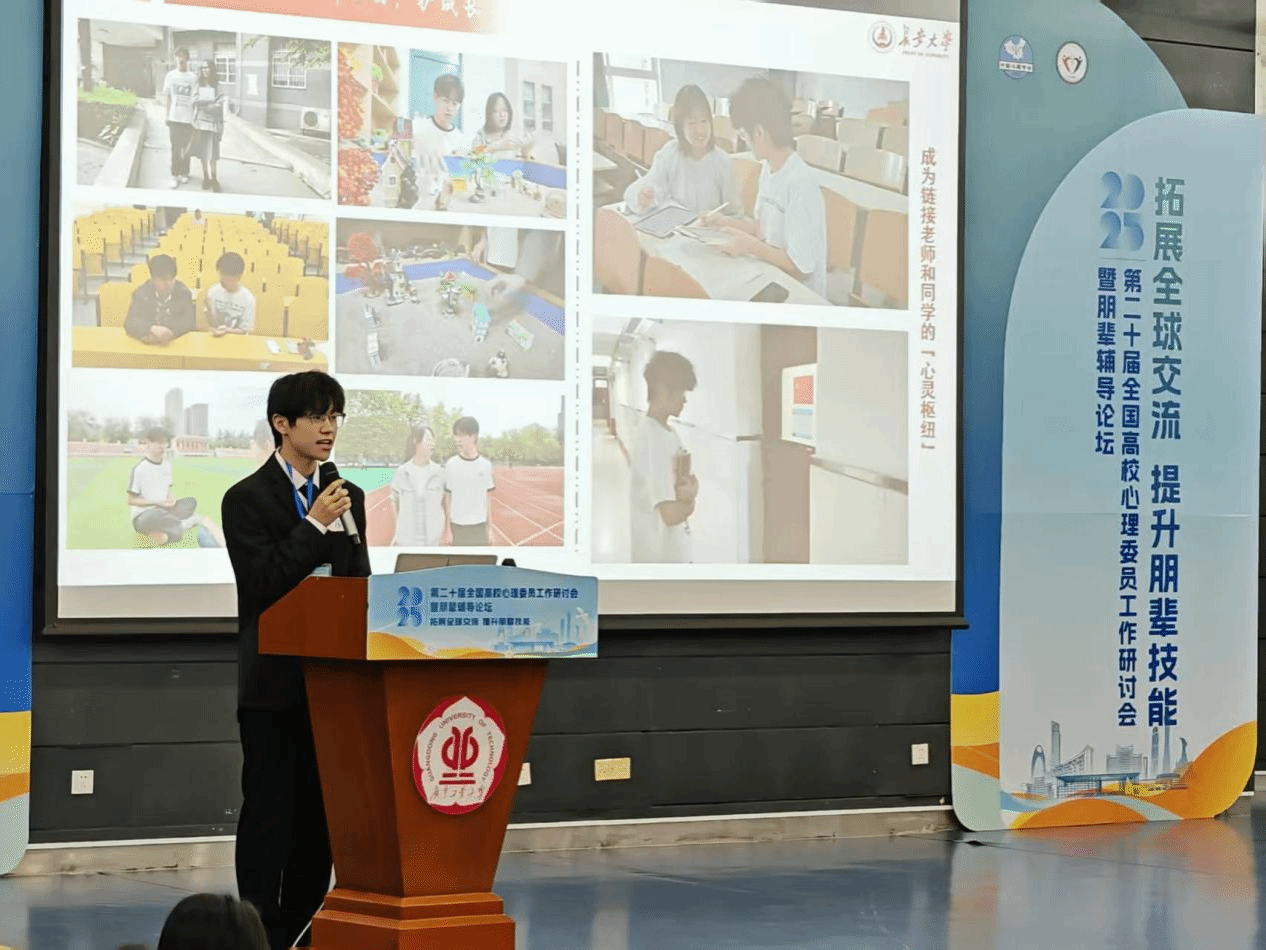 本次论坛以“拓展全球交流,提升朋辈技能”为主题,旨在加强高校心理委员队伍建设,促进心理健康教育理论与实践交流。会议期间,KY开元师生代表认真听取“朋辈心理帮扶技术”“危机干预程序”等主题报告,并与各高校代表深入交流。在分论坛环节,梁俊辉作题为《“铸魂·润心·筑桥”——思政与心理双轮驱动的育人实践探索》的主题报告。他从“价值引领筑牢思想根基、品牌活动涵育健康心态、机制建设贯通育人脉络”三个维度,系统介绍了KY开元心理委员在心理育人方面的创新实践。报告结合“情绪盲盒”“绿叶传情”“绿植领养”等品牌活动案例,生动阐释了如何通过搭建内容、机制与传播之桥,实现思政育人与心理育人的深度融合,展现了KY开元“思政与心理双轮驱动”育人模式的实效,赢得了与会代表的广泛共鸣。