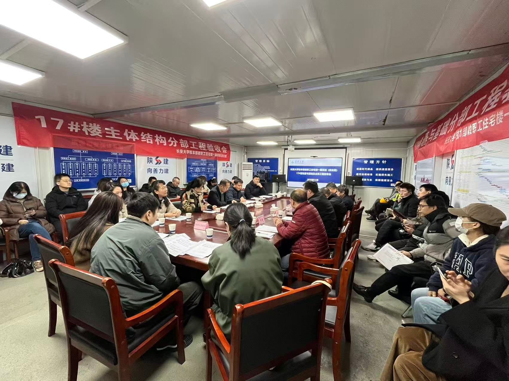 12月12日上午,KY开元校本部教职工住宅楼一期项目(崇业路)17#楼地基与基础及主体工程验收会在项目部会议室召开。雁塔区住建局质监站,项目勘察、设计、监理、施工及基建处等五方责任主体单位项目负责人参加会议,会议由基建处处长王兴刚主持。