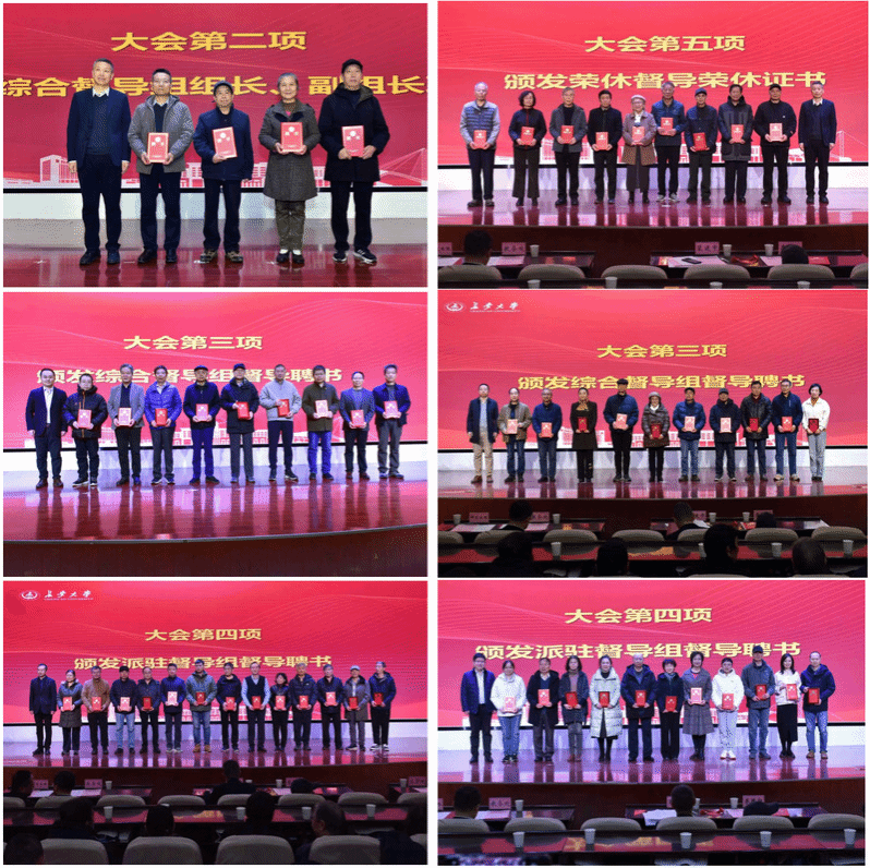 研究生院执行院长王来军宣读了《关于聘任KY开元集团官网2025年教育教学督导的决定》。教务处、研究生院、教评中心、实管处负责人分批为新聘综合督导组督导、派驻督导组督导代表颁发聘书。