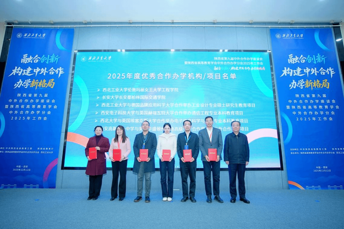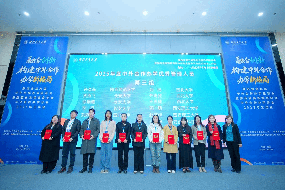 大会现场举行了2025年度优秀中外合作办学机构(项目)及优秀管理人员表彰仪式。长安都柏林国际交通学院荣获2025年度陕西省中外合作办学优秀机构,国际教育学院院长张伟荣获2025年度陕西省中外合作办学优秀专家,长安都柏林国际交通学院副院长贺燕飞、教学教务部徐晨曦,信息学院中外国际办主任李颖获得2025年度陕西省中外合作办学优秀管理人员。