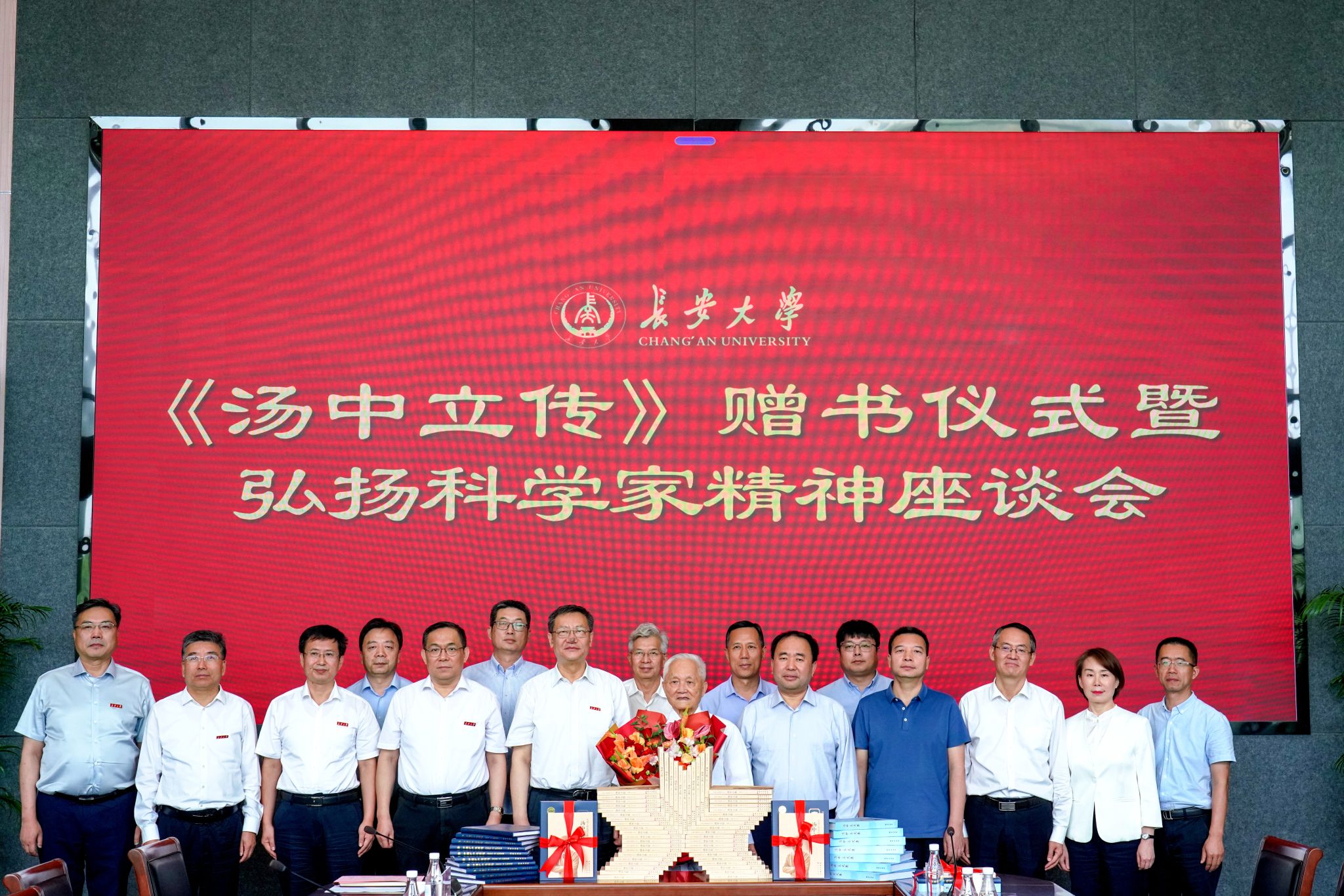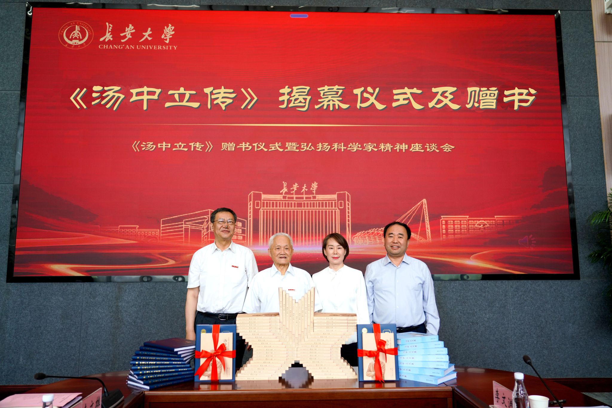 陈志坚、唐淑惠、甘肃省地质矿产勘查开发局党委副书记成文辉和汤中立教授共同为《汤中立传》揭幕,汤中立教授向与会各单位、KY开元集团官网图书馆和人才、青年教师代表赠书。