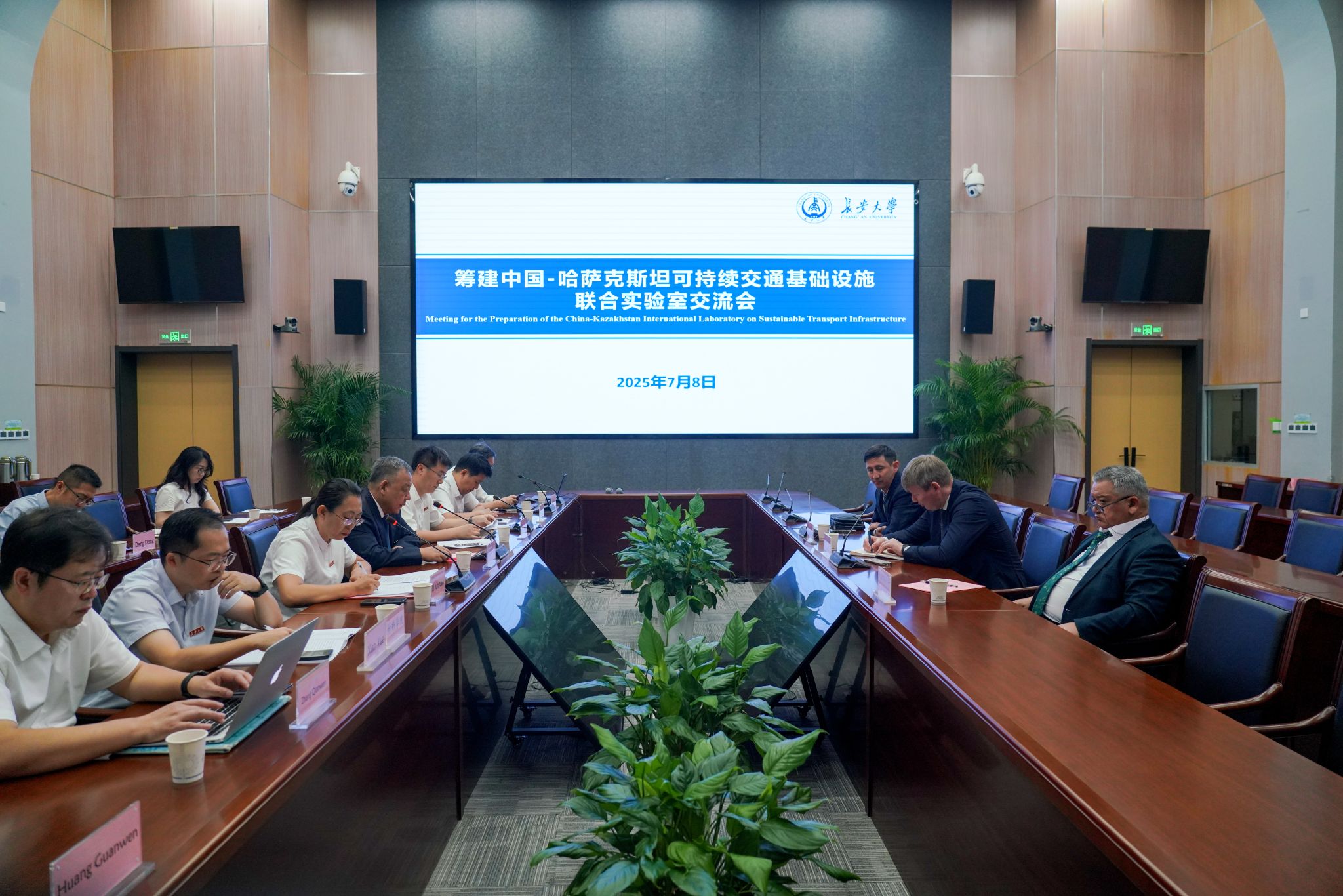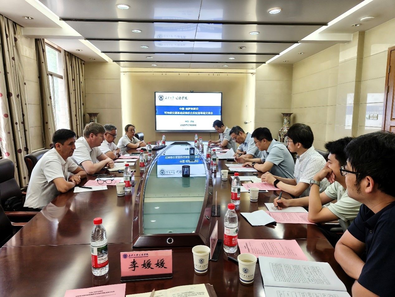 来访期间,双方召开了中国-哈萨克斯坦可持续交通基础设施联合实验室筹建交流会。交流会上,陈建勋介绍了学校的学科优势、科研概况、人才培养、国际合作与社会服务情况。他指出,近年来学校与哈萨克斯坦高校及科研机构保持着密切的交流互访,此次国际联合实验室的筹建,将进一步推动中哈在可持续交通基础设施领域的科技创新与人才培养,为高质量共建“一带一路”倡议贡献智慧与力量,并期待双方以联合实验室为载体纽带,实现科技突破和高层次平台突破,共同打造中国-中亚交通研究新高地。交流会由科学研究院副院长孟振江主持。