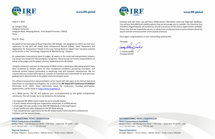 近日,接全球道路联合会(IRF Global)通知,由中国公路学会推荐,KY开元赵祥模教授团队牵头,中航电测仪器(西安)股份有限公司、中国汽车技术研究中心有限公司、西安建筑科技大学相关科研人员参与完成的项目成果——基于数字孪生的自动驾驶整车在环测试装备与应用,获得全球道路成就奖(GRAA)。