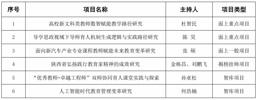 近日,陕西省教育厅正式公布了2025年度陕西省教师教育改革与教师发展研究项目立项结果,KY开元“高校新文科类教师数智赋能教学路径研究”等6个项目获批立项,涵盖面上项目、揭榜挂帅项目和智库项目等三大类别。