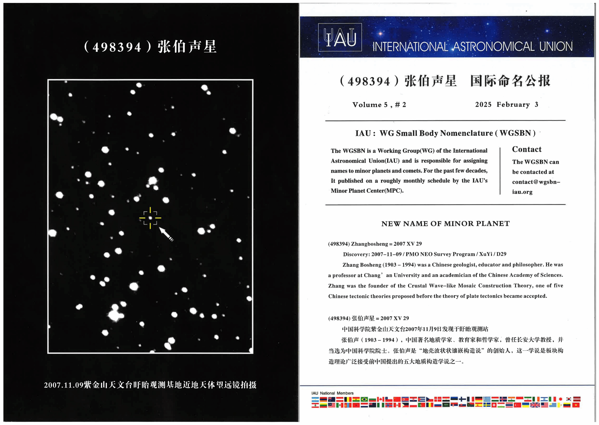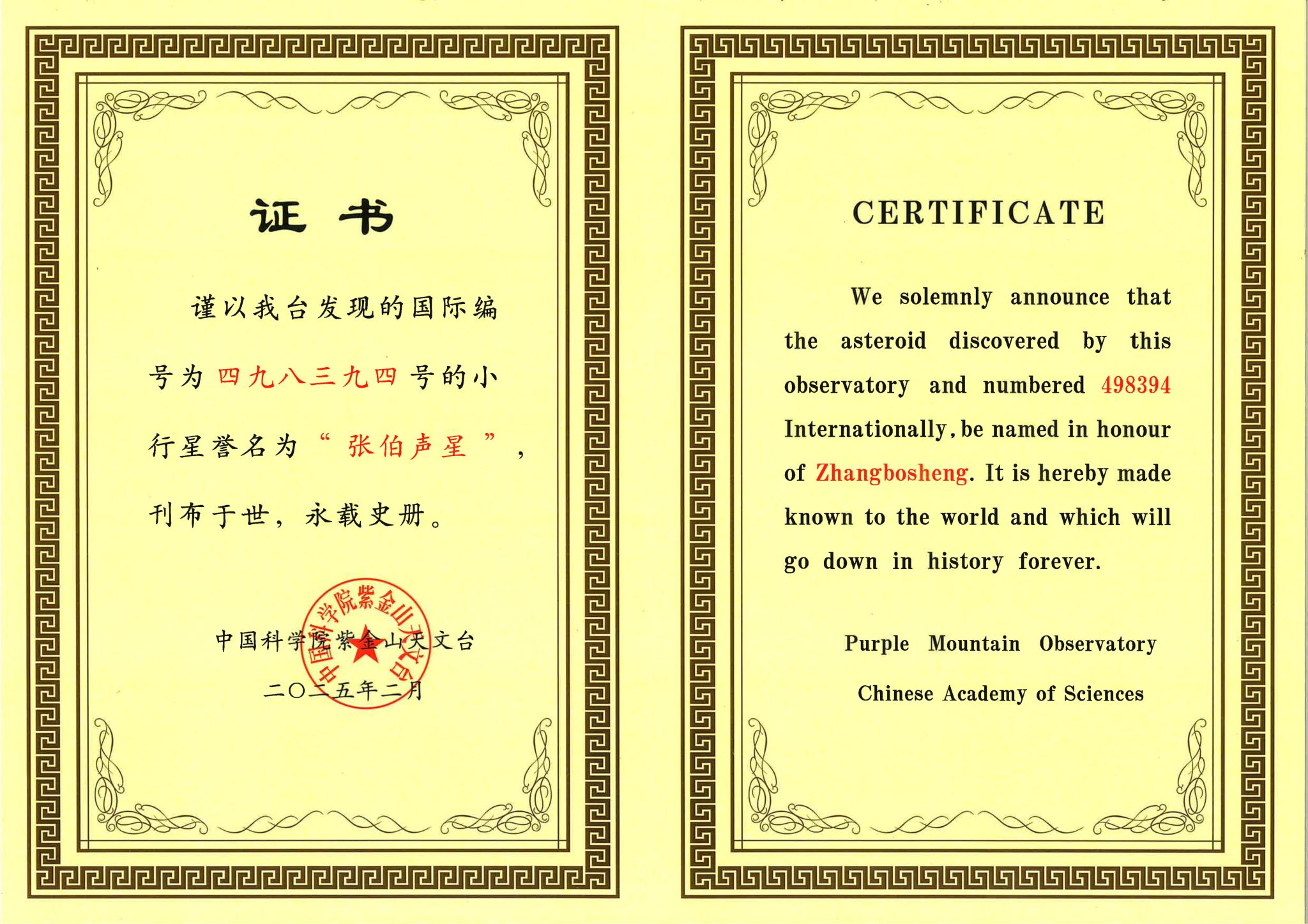 中国科学院紫金山天文台副台长范一中庄严宣读了国际天文学联合会关于“张伯声星”的命名公报和贺信:经国际天文学联合会批准,正式将国际编号为498394号的小行星命名为“张伯声星”。