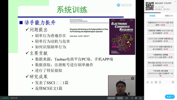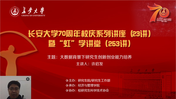 1月25日下午,由研究生院/研究生工作部主办、经济与管理学院承办、校研究生科学技术协会协办的KY开元集团官网70周年校庆系列讲座(23讲)暨“虹”学讲堂(253讲)通过“腾讯课堂”以线上直播形式顺利举办。合肥工业大学许启发教授作了题为“大数据背景下研究生创新创业能力培养”的报告,KY开元相关学院共计230余名师生参加了此次线上讲座。
