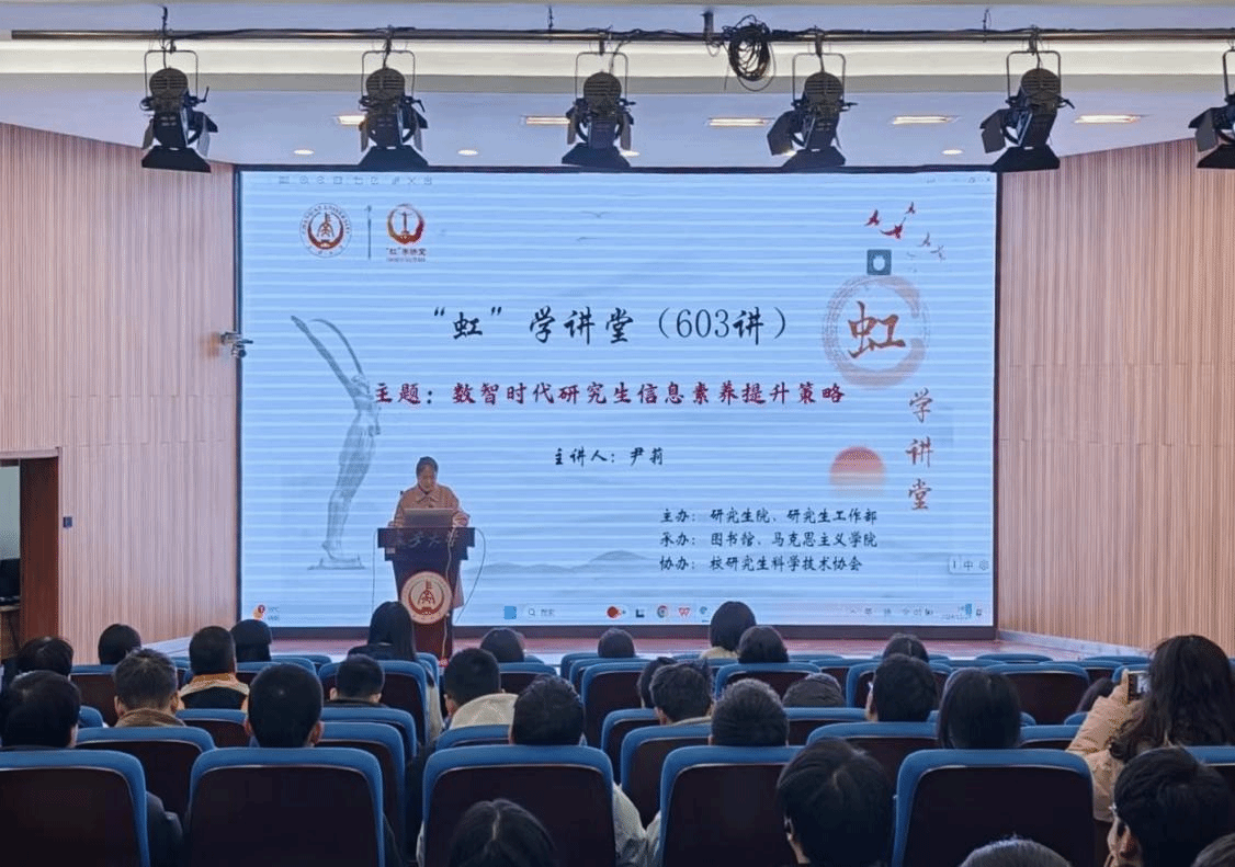 11月28日下午,由研究生院、研究生工作部主办,图书馆、马克思主义学院承办,校研究生科学技术协会协办的“虹”学讲堂第603讲在南校区东院伯声报告厅举办。KY开元集团官网图书馆尹莉研究馆员作题为“数智时代研究生信息素养提升策略”的报告,相关学院共130余名师生参加讲座。
