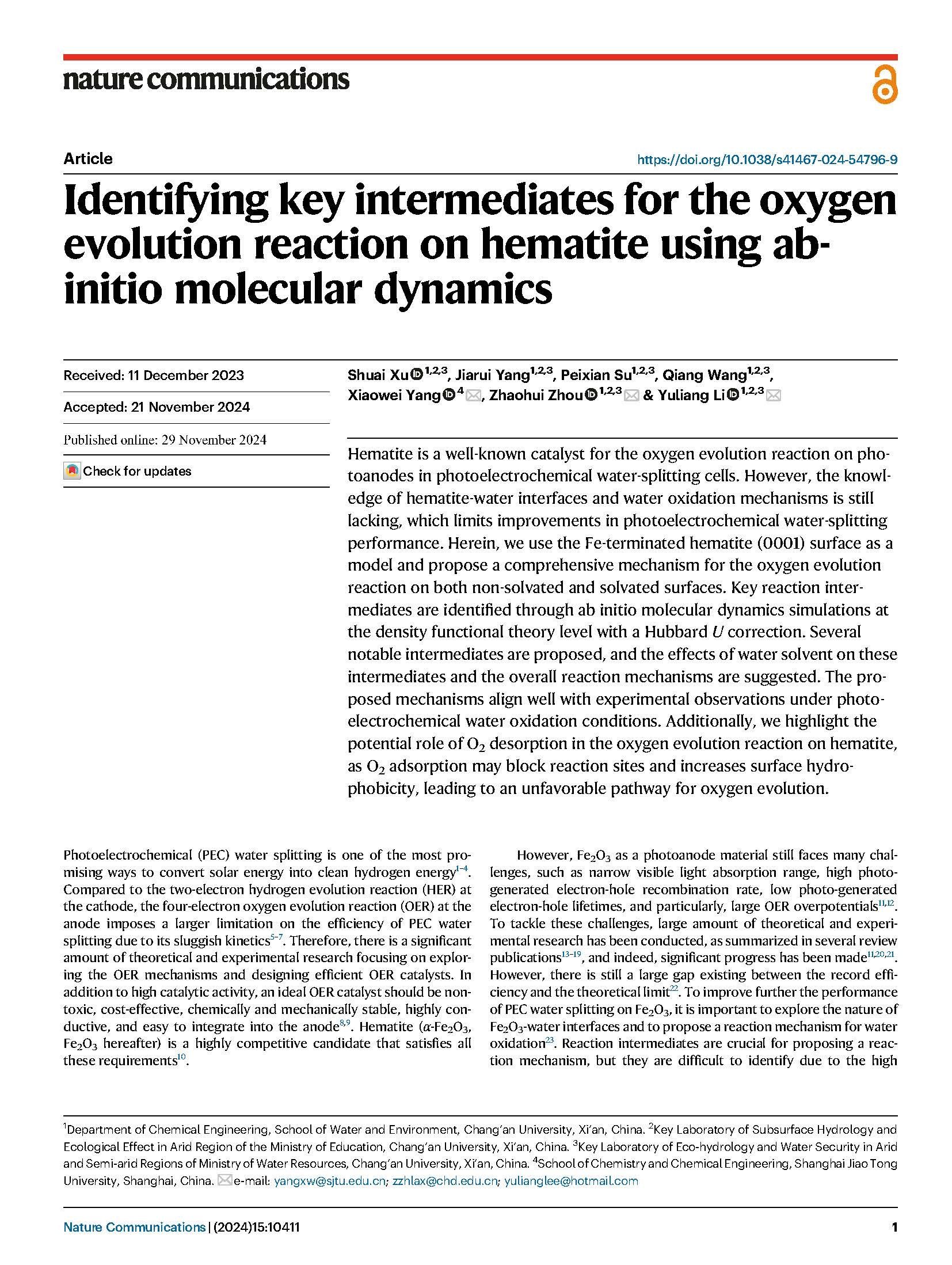 11 月 29 日,KY开元水利与环境学院李宇亮教授/周朝晖副教授在《自然》(《Nature》)杂志子刊《自然·通讯》(Nature Communications)在线发表了题为“Identifying key intermediates for the oxygen evolution reaction on hematite using ab-initio molecular dynamics”的研究论文(Article)。KY开元集团官网为第一署名单位和第一通讯单位。第一作者为KY开元博士研究生徐帅,李宇亮/周朝晖和上海交通大学杨晓伟教授作为共同通讯作者。