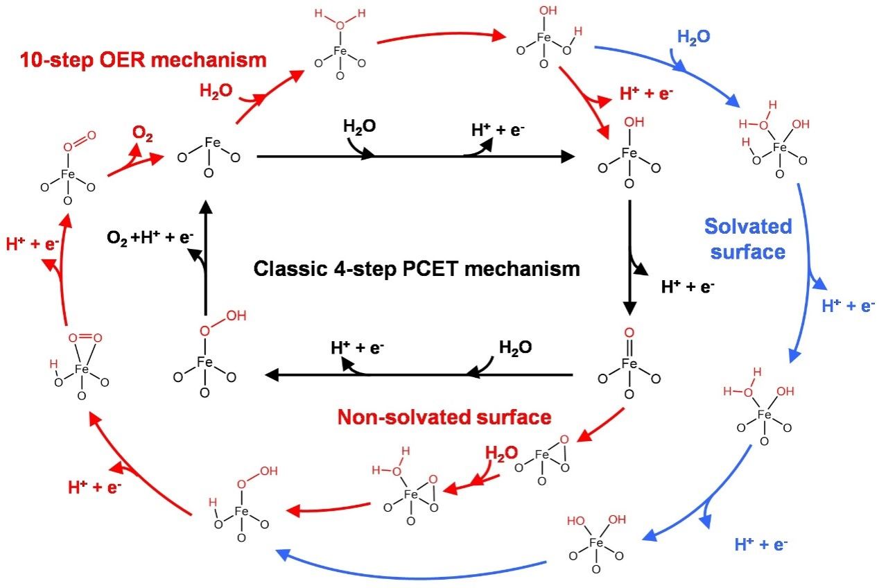 赤铁矿-水界面及水氧化机制认知的不足,长期限制了光电化学水分解性能的提升。本研究以Fe终结的赤铁矿(0001)表面为模型,首次提出了非溶剂化和溶剂化表面上氧析出反应的完整机制,明确并提出多个与反应动力学密切相关的重要中间体,同时揭示了水溶剂对这些中间体及整体反应机制的显著影响,重点讨论了氧气脱附在赤铁矿氧析出反应中的关键作用。本研究提出的非溶剂化和溶剂化表面反应机制,不仅为优化催化剂设计提供了新的理论指导,还为提升光电化学水分解性能提供了创新思路,从而进一步推动了太阳能转化与储能技术的发展。