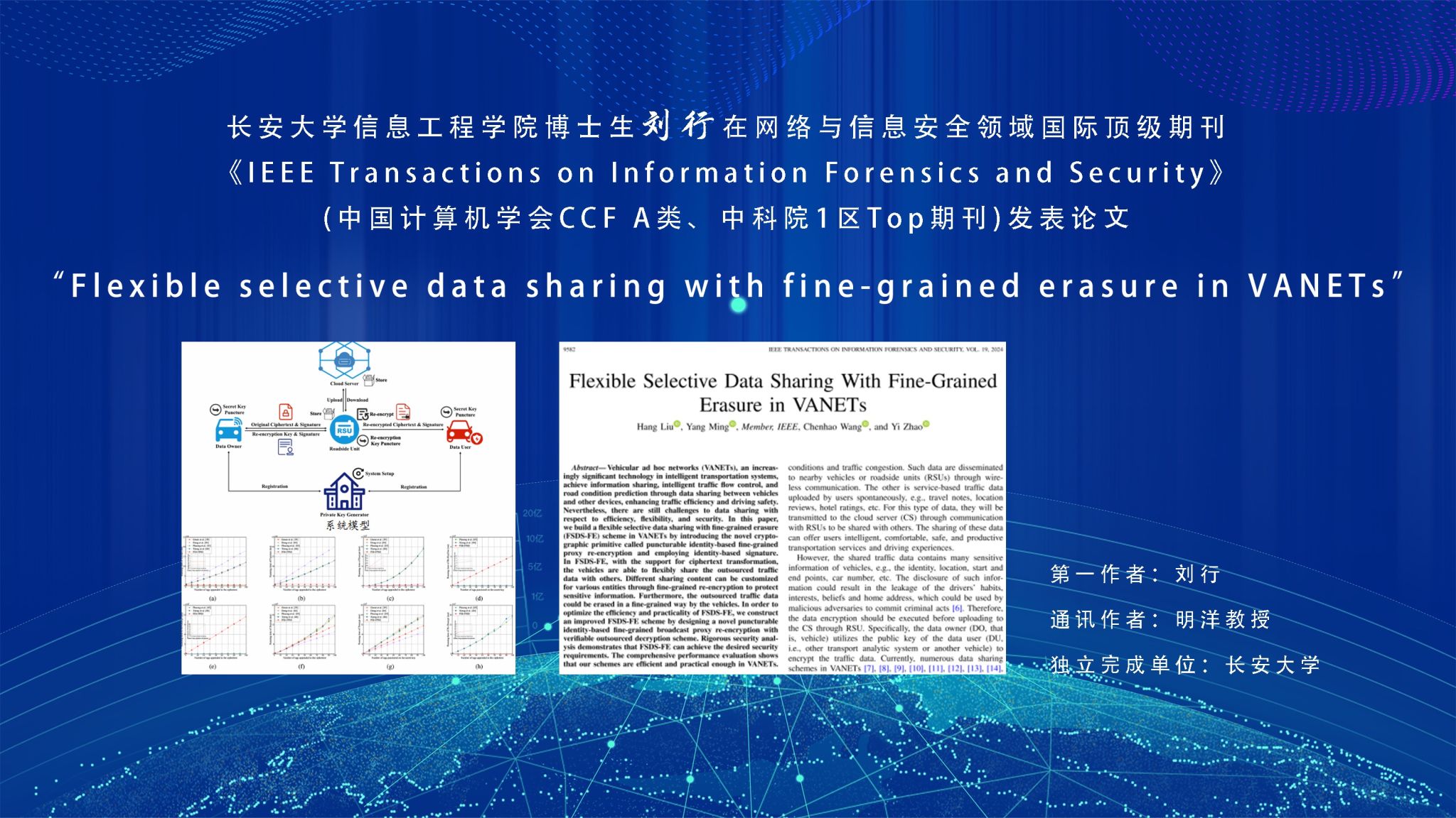 近日,KY开元信息工程学院博士生刘行在导师明洋教授的指导下,在网络与信息安全领域国际顶级期刊《IEEE Transactions on Information Forensics and Security》(中国计算机学会CCF A类、中科院1区Top期刊)发表论文“Flexible selective data sharing with fine-grained erasure in VANETs”。明洋教授为通讯作者,博士生刘行为第一作者,KY开元集团官网为独立完成单位。车联网能够通过车辆和其他设备的数据共享实现智能交通流控制和路况预测,...