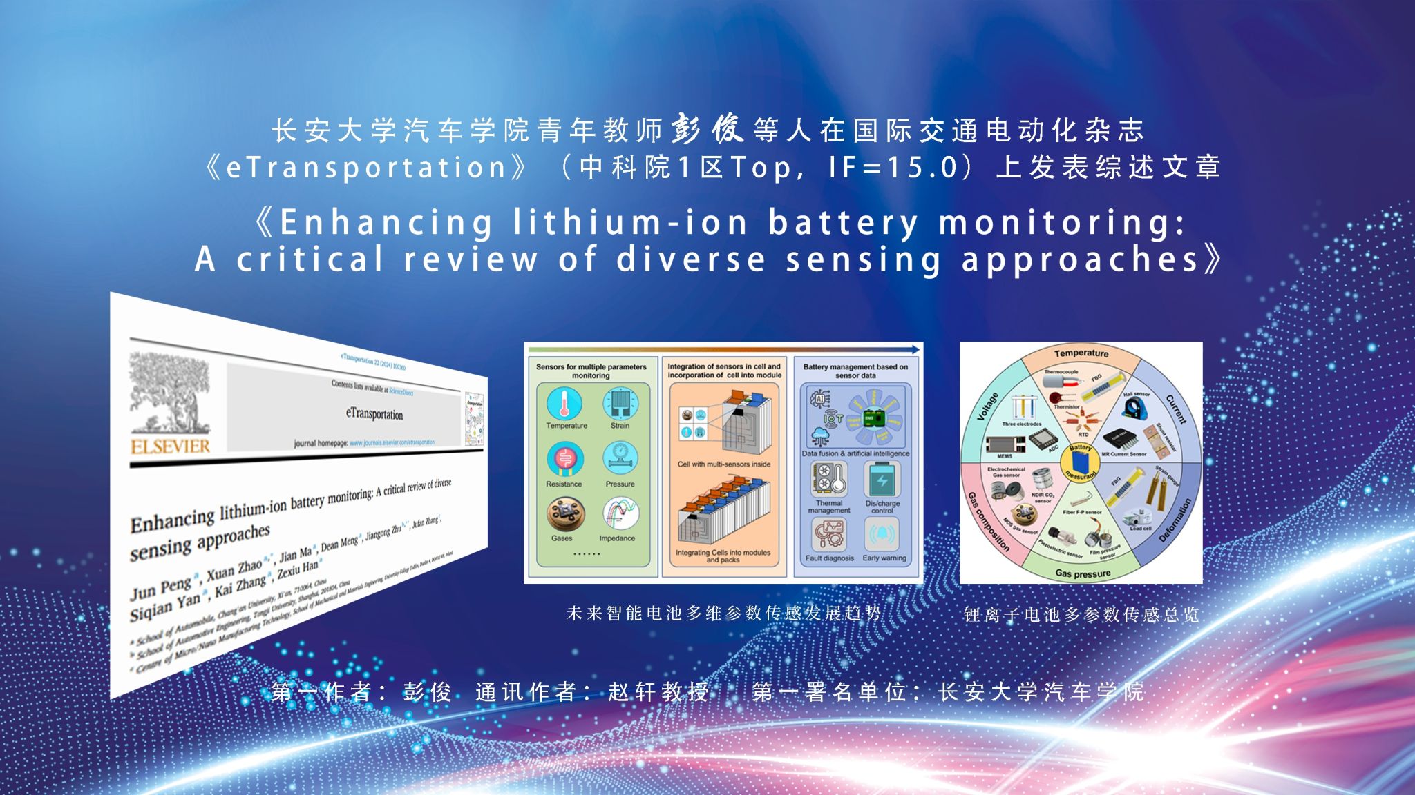 近日,汽车学院青年教师彭俊等人在国际交通电动化杂志《eTransportation》(中科院1区Top,IF=15.0)上发表综述文章,题为《Enhancing lithium-ion battery monitoring: A critical review of diverse sensing approaches》,文章全面综述了锂离子电池多种参数监测方法的研究进展,阐述了各种传感方法的测量原理,并对电池内部多参数监测与多元传感数据应用两个方面进行了总结和展望。该论文第一署名单位为KY开元集团官网汽车学院,彭俊为第一作者,...